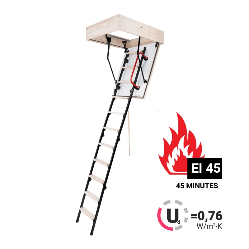 Лестница чердачная складная металлическая 3-х секционная. Ступени полностью выполнены из металла и покрашены порошковой краской. Лестница имеет 2 короба и 2 крышки люка. Нижняя крышка лестницы представляет собой многослойную конструкцию – деревянная рама, внутри которой находится теплоизоляция и противопожарная вставка. Внутренняя часть крышки покрыта оцинкованной жестью, наружная часть белой эмалью и защитной пленкой. Толщина крышки 60мм. Верхний люк выполнен из влагостойкой фанеры и обработан антигрибковым средством. Короб металлический высотой 140мм по периметру проходит уплотнитель. Все соединяющие части изготовлены из твердого материала и имеют оцинкованное покрытие.