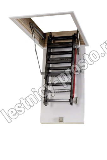 Лестница обладает повышенной теплоизоляцией и низкими показателями воздухопроницаемости крышки. Облегченная крышка люка изготовлена из пенополистирола без применения дополнительных деревянных элементов. Наконечники имеют возможность регулировки, что позволяет подогнать длину лестницы по высоте помещения в случае излишнего подрезания лестницы или изменения толщины пола.