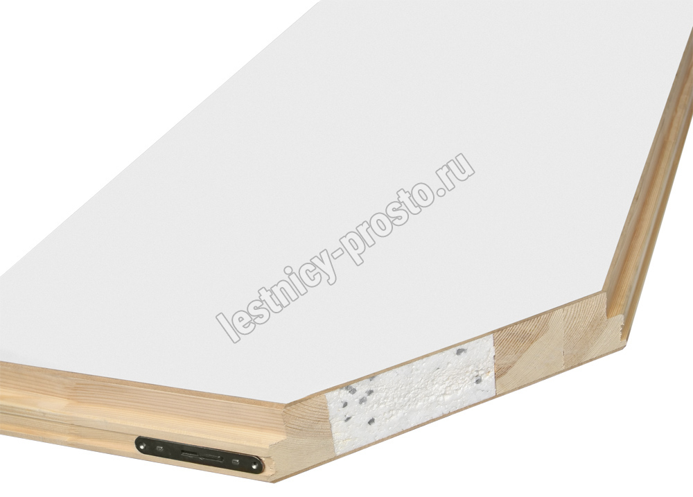 Данную модель лестницы можно использовать даже в домах, где значительна разница температур между этажами, и тем самым ограничить проникновение холода в жилые помещения. Лестница состоит из трех секций, которые компактно складываются и «хранятся в потолке». Крышка люка облицована ДВП белого цвета, что делает ее практически незаметной при установке в светлом или белом потолке.