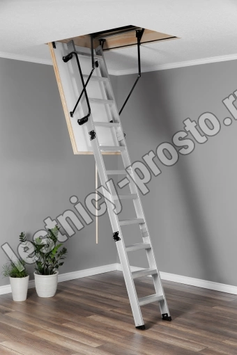 Складная 4-х секционная чердачная лестница. Рабочая поверхность полностью выполнена из алюминия. Термоизоляционная крышка типа "сэндвич" имеет усиленную теплозащиту, облицована с двух сторон ДВП белого цвета. По контуру короба имеется уплотнитель; Все металлические элементы лестницы покрыты порошковой краской.