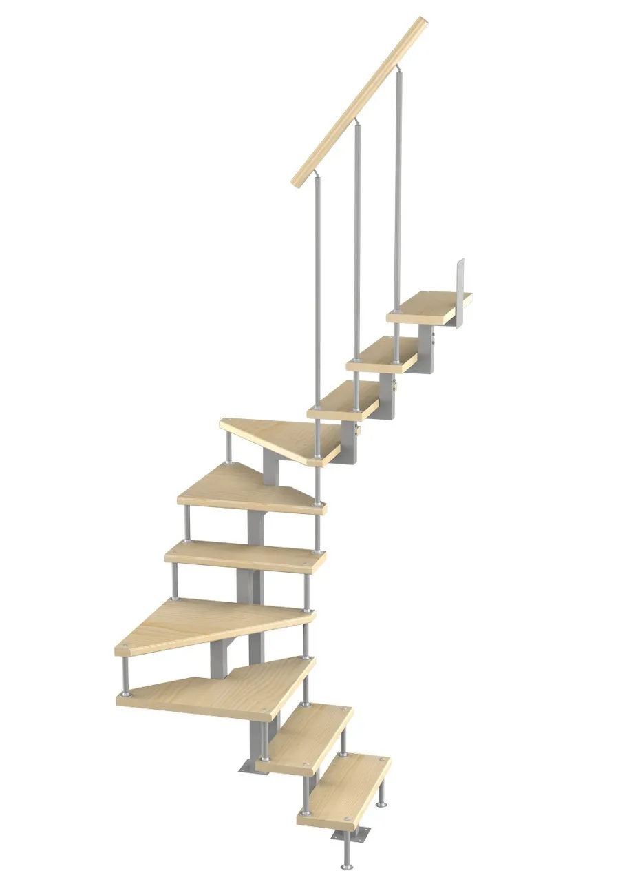 Удобная поворотная лестница на второй этаж. Дополнительные ограждения по первому маршу обеспечивают безопасность при подъеме и спуске, кроме того, небольшой угол подъема открывает всю площадь ступеней. Монтаж осуществляется силами двух человек на объекте по указаниям, приведенным в паспорте на лестницу.