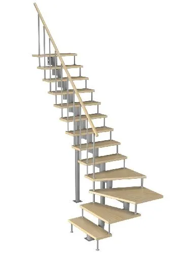 Удобная поворотная лестница на второй этаж. Дополнительные ограждения по первому маршу обеспечивают безопасность при подъеме и спуске, кроме того, небольшой угол подъема открывает всю площадь ступеней. Монтаж осуществляется силами двух человек на объекте по указаниям, приведенным в паспорте на лестницу.