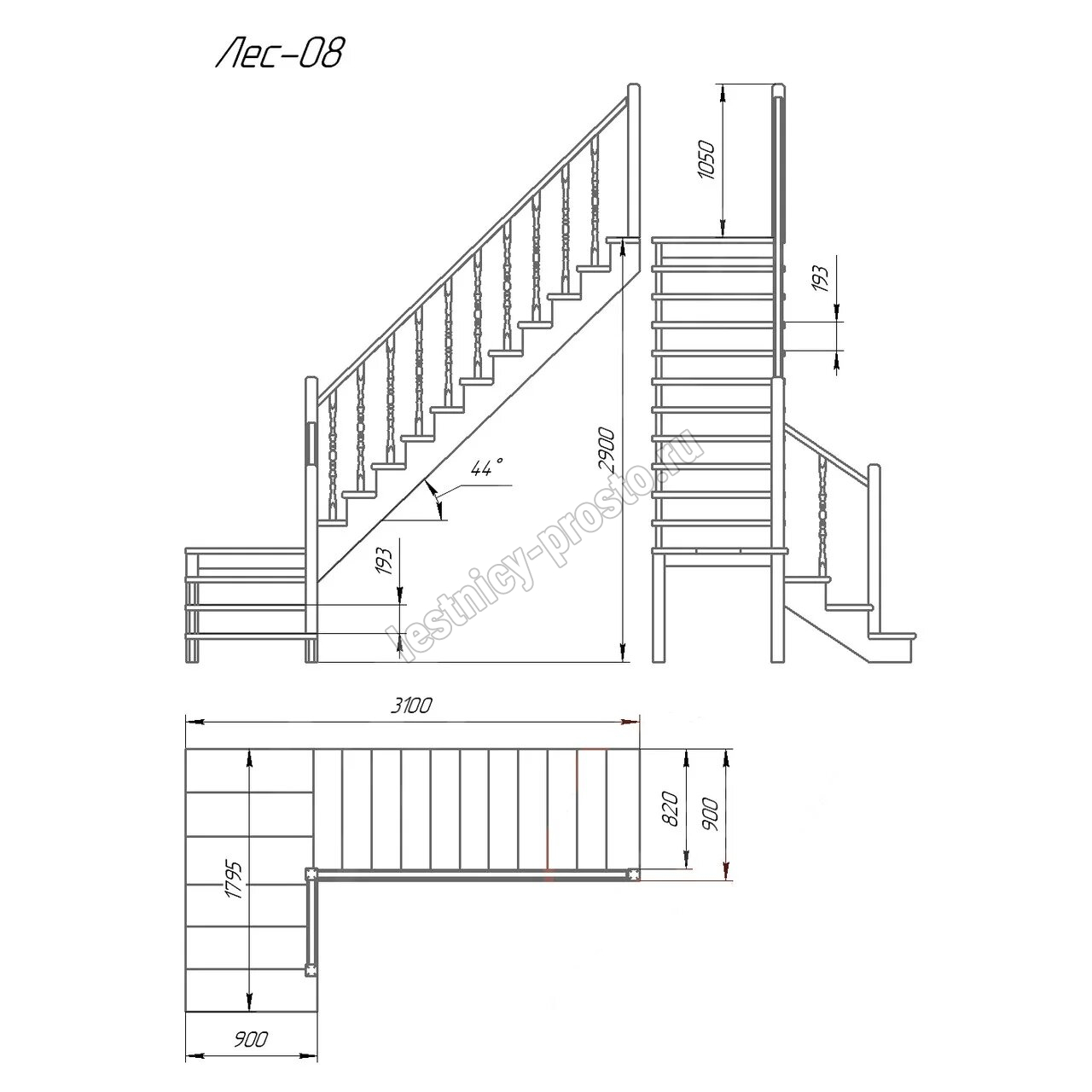 | Деревянная межэтажная лестница ЛЕС-08, Лиственница |