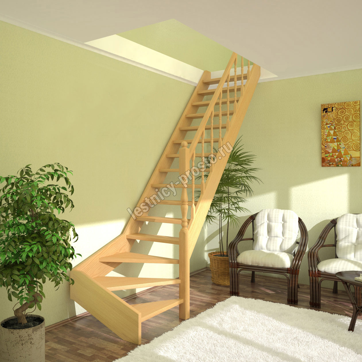 Классическая деревянная лестница с удобным забежным поворотом. Лестница без какого-либо покрытия. В комплекте элементы лестницы и ограждения в разобранном виде, необходимый крепеж, инструкция по сборке.