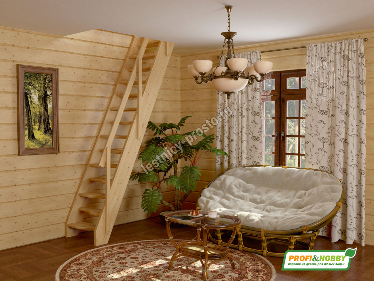 Ступени и поручень лестницы изготовлены из дуба, остальные элементы из сосны.