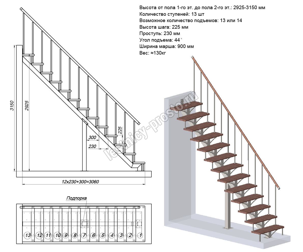 Лестница PROSTO MONO прямая, h315 см, ступени лиственница