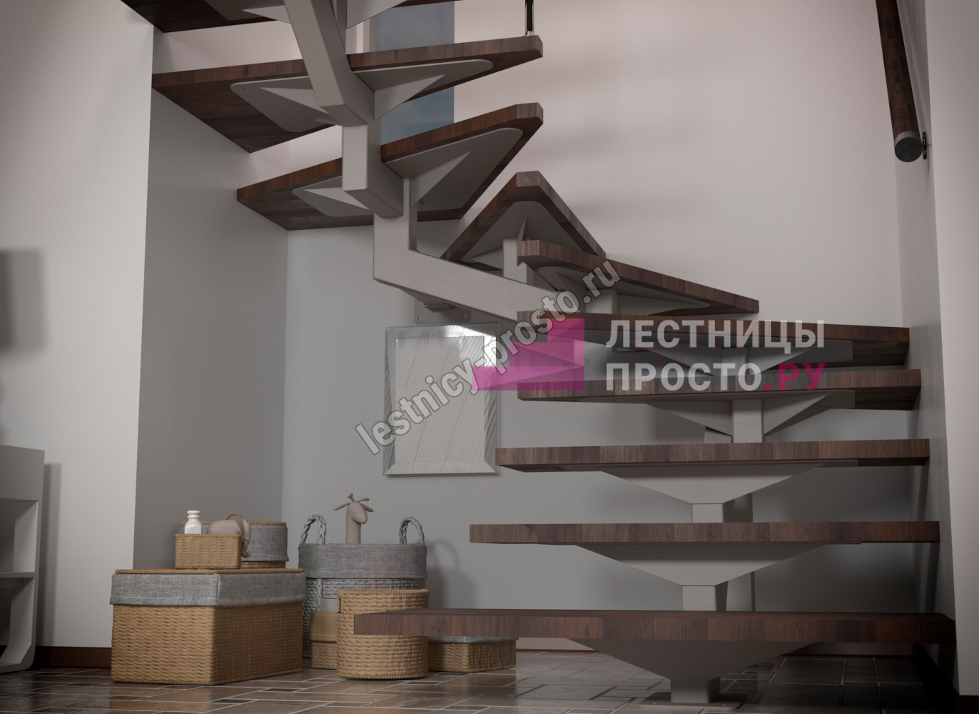 Конструкция представляет собой стальной монокосоур, на который крепятся ступени из выбранной породы дерева.