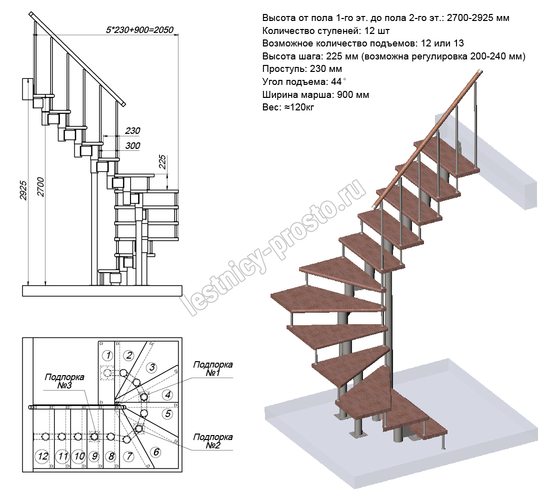 Высота лестницы 2700 - 2925 (12 ступеней) мм