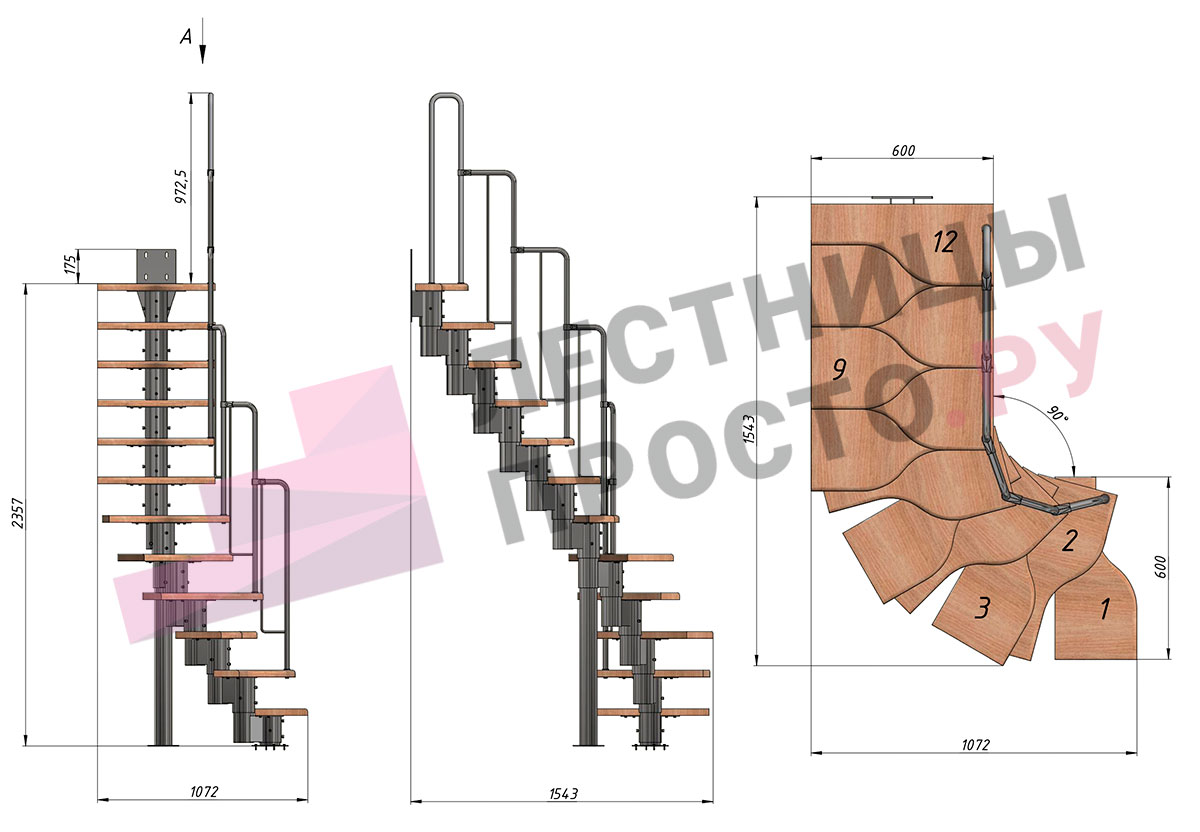 | Лестница Prosto Urban Grey г-образная гусиный шаг 600 мм, h216-312 см (12 ступеней) |