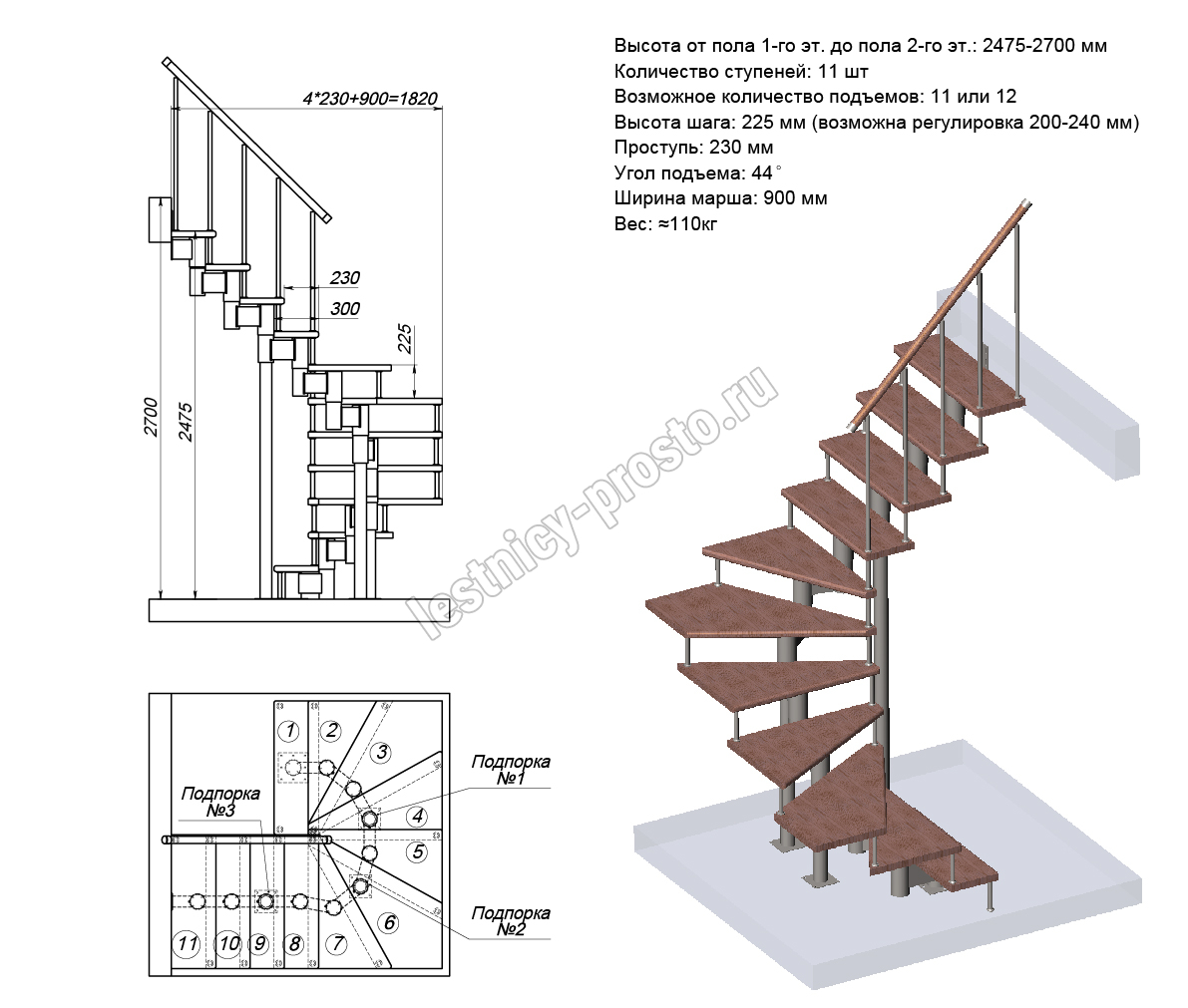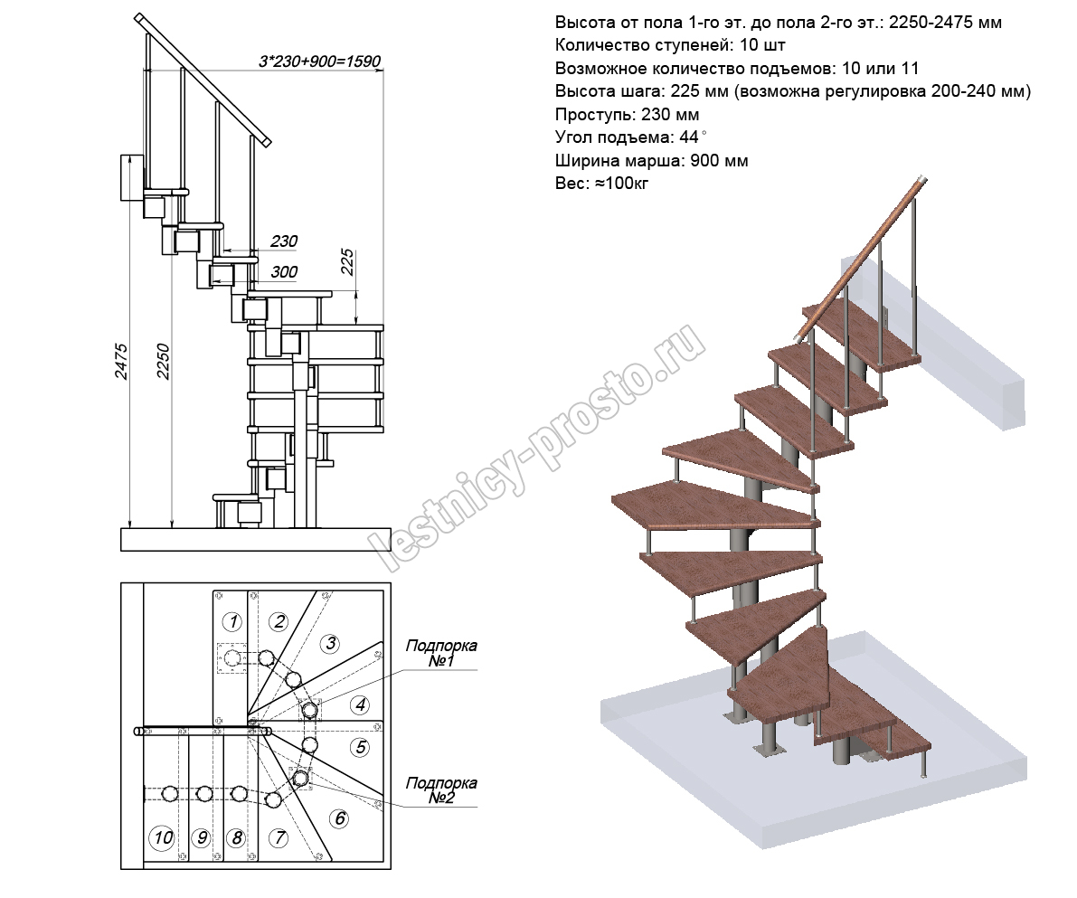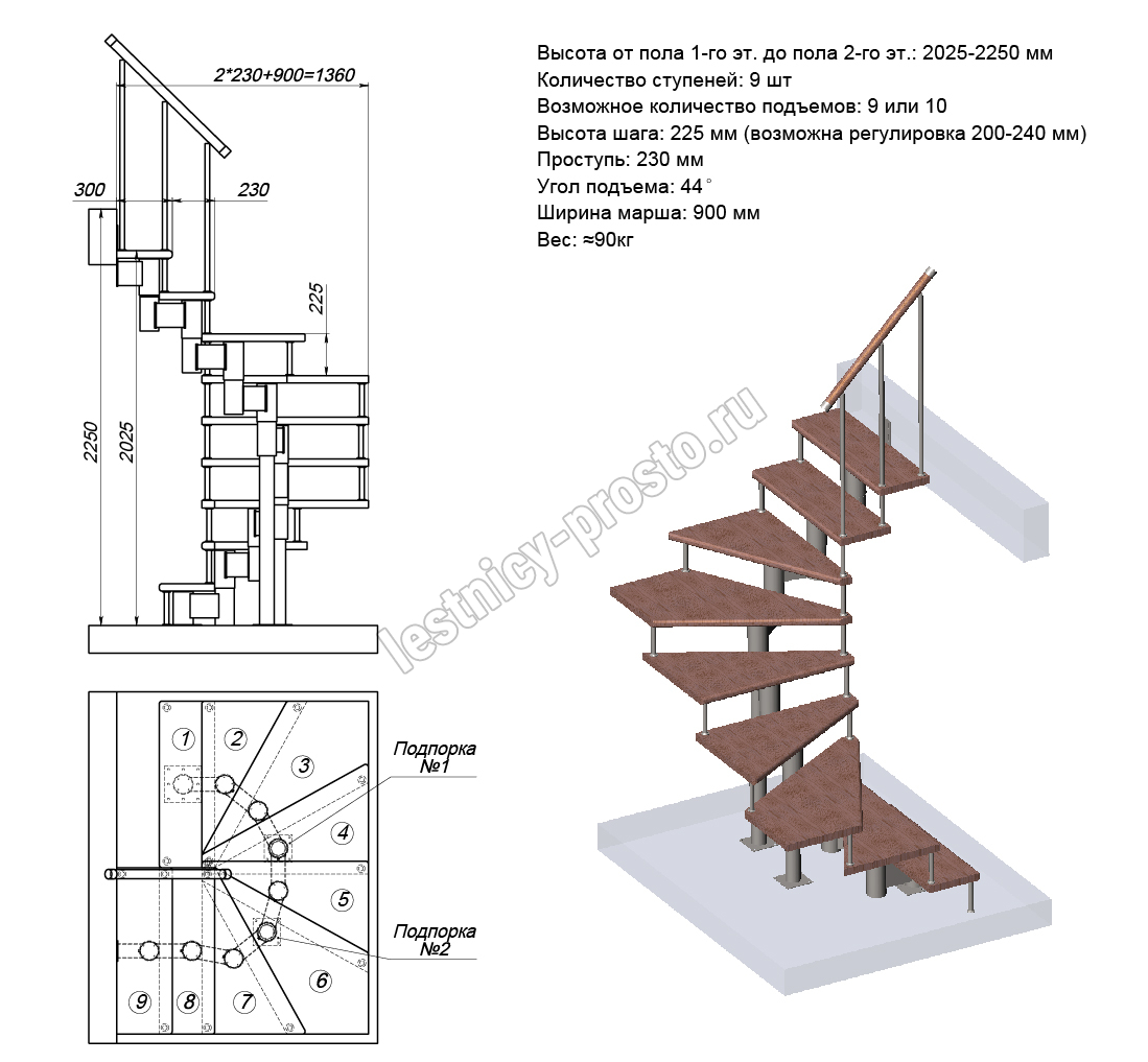 Схема и расчет указаны для шага 225 мм - мы рекомендуем эту высоту шага, как оптимальную для обеспечения комфортного подъёма и экономии бюджета.