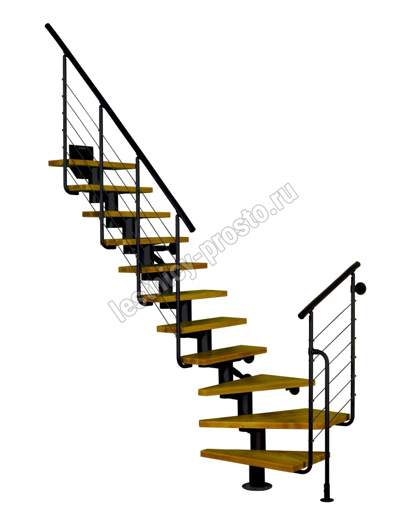 Есть возможность регулировать высоту ступеней. В комплект входят перила с вертикальными стойками и горизонтальными перегородками.