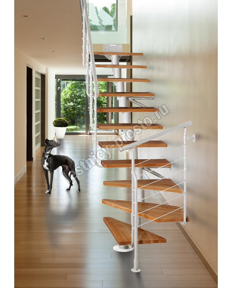 ATRIUM DIXI PLUS - это современная и удобная лестница, занимающая сравнительно мало места. В набор входят 11 конструктивных элементов и 11 ступеней из массивного лакированного дерева (8 прямых ступеней и 3 забежные ступени).