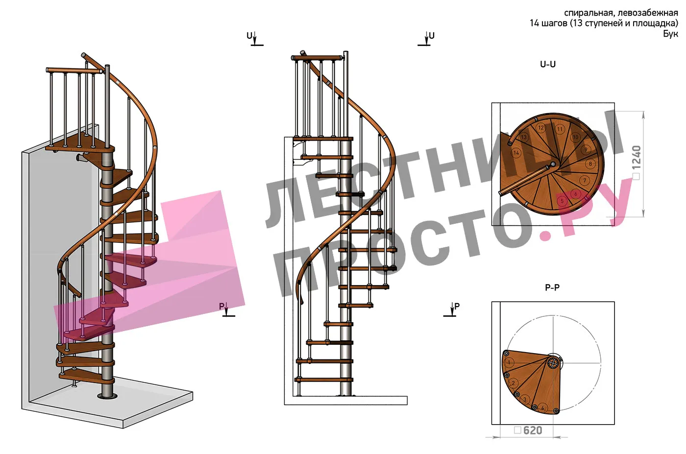 Решение о направлении поворота принимается при сборке лестницы - универсальная конструкция позволяет собрать правозабежную и левозабежную лестницы. Высота ступеней регулируется с шагом 3 мм. в пределах 217-247 мм., благодаря чему, лестница прекрасно подгоняется под необходимую высоту.