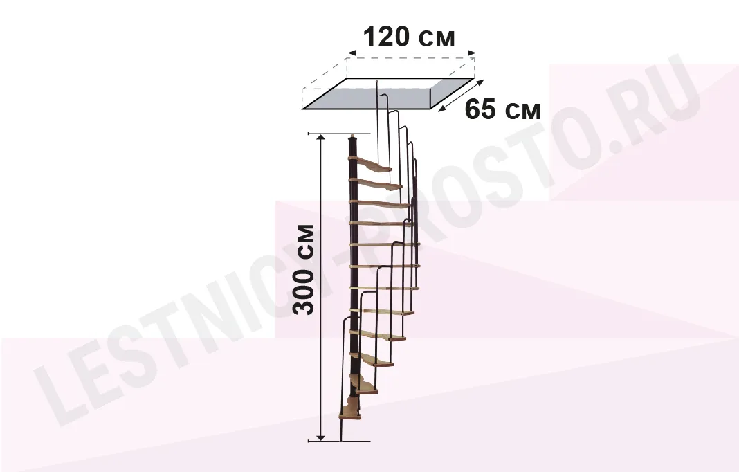 Компактная надёжная лестница. Ступени толщиной 30 мм, изготовлены из массива берёзы по технологии Multiplex, лакированные. Все металлические части оцинкованы, горячим способом и покрыты порошковой краской - черного цвета; Лестница имеет надёжную несущую стальную конструкцию.